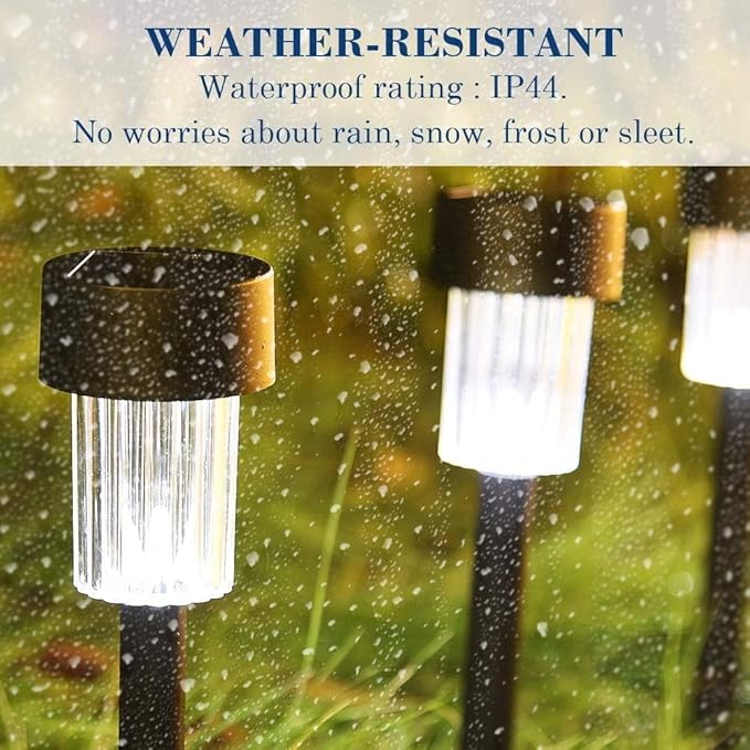 - IP44 WATERPROOF: No worry about about rain and snow weather, there solar lights are perfect decor for your outdoor walkway, pathway, driveway and so on