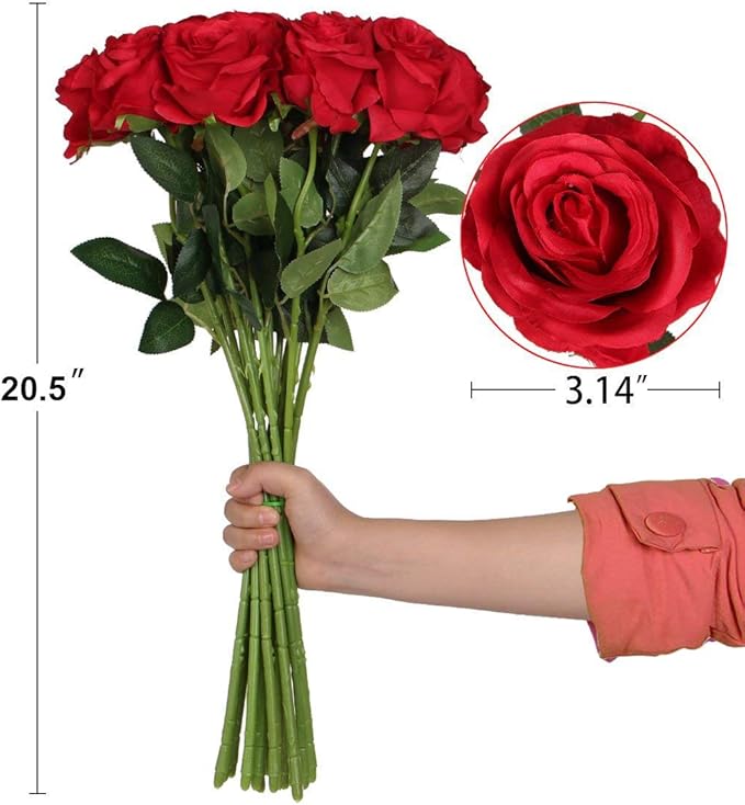 AMZALI Artificial Flowers, Real Looking Blush Fake Rose Long Stem Silk Artificial Rose Flowers Home Decor for Bridal Wedding Bouquet, Centerpieces Birthday Flowers Party Garden Floral Arrangement Red