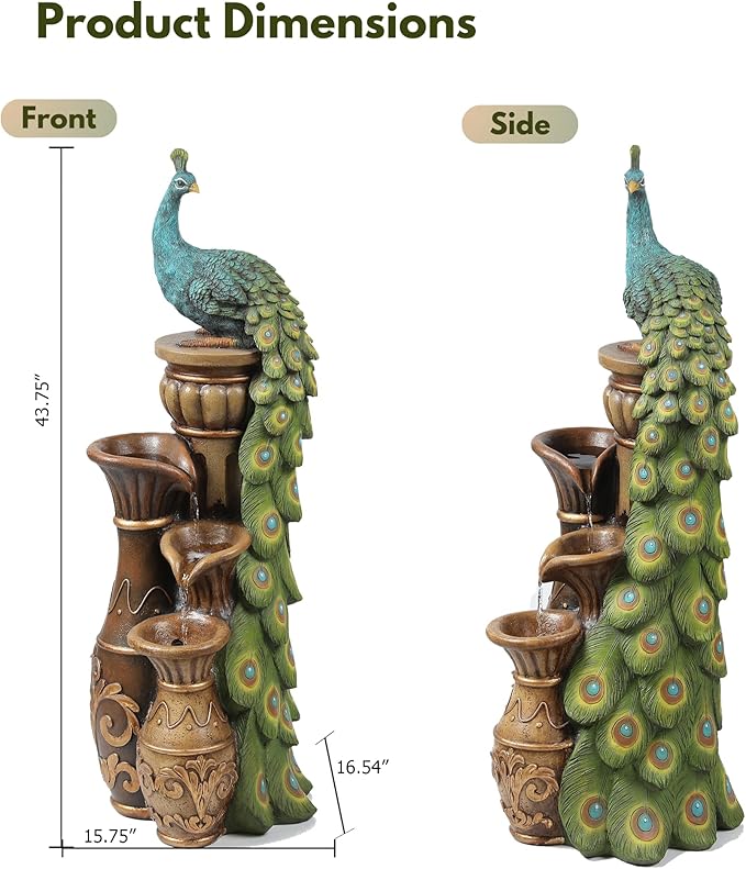 LuxenHome Outdoor Water Fountain, 44 Inch Resin Peacock Water Fountain Outdoor with Urns and LED Light, Tall Fountains Outdoor for Garden, Waterfall for Patio, Brown/Teal