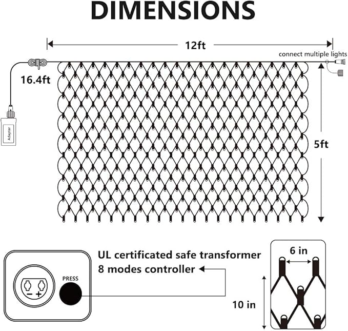 - Timer Function: Activate the timer by long pressing the button on the adaptor for 3 seconds until the timer indicator lights up. Timer keeps the Christmas net lights on for 6 hours and off for 18 hours, freeing your hands and saving energy.