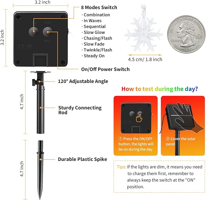 - 【Auto On/Off Management】There is a built in photosensitive component in the solar panel, the Christmas Snowflake lights will turn on at dusk and turn off at dawn automatically; No need for manual operation, so convenient for lighting decor; If you have any questions with our products, Please feel free to contact us.