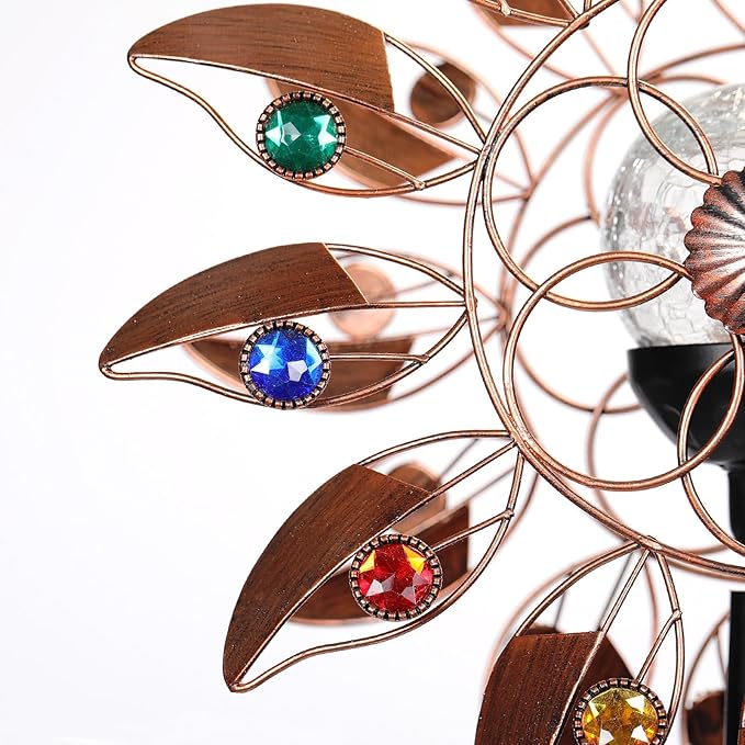 - KINETIC DESIGN: The crackle glass ball sits between two tiers of gracefully spinning wind blades, offering a stunning display of jewel tone colors for up to 8 hours.During the day, enjoy the kinetic movement of the wind spinner while the solar panel converts sunlight to electricity. At night, the spinner?s LED light provides an ambient color changing light display