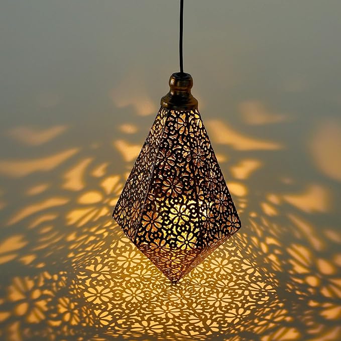 - 2 Pack Unique Diamond Shape Hanging Lantern: MAGGIFT outdoor solar lanterns equipped with sensitive light sensor as well as high quality and durable iron (antique bronze finish) and ABS material, neither get faded or deformed easily. The warm white light after full sun is much more soft and gentle. It shines a wonderful light on the floor and enriches the atmosphere of joy in your house, filling the surroundings with peace and beauty.