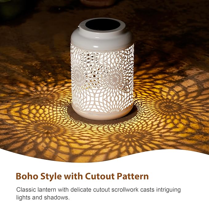 - SOLAR LANTERN DESIGN - The outdoor solar lights are modern and classic in design, with delicate openwork scrolling floral patterns and warm white LEDs that cast captivating glow, adding artistic beauty and visual interest to any space. They are the ideal fixtures to decorate patios, gardens, walkways, and yards