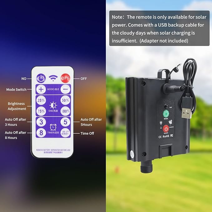- 【8 SETTING MODES WITH DIMMABLE REMOTE】 8 lighting modes to change:combination, in wave, sequential, slo-glo, chasing/flash, slow fade, twinkle/flash, and steady-on.You can transfer the modes by the button on the back of the solar panel or by the remote. The settings can be set easily by pressing the buttons on the remote: timing or lights moede changing.PLS NOTE: The remote only work for the solar modes NOT for the plug