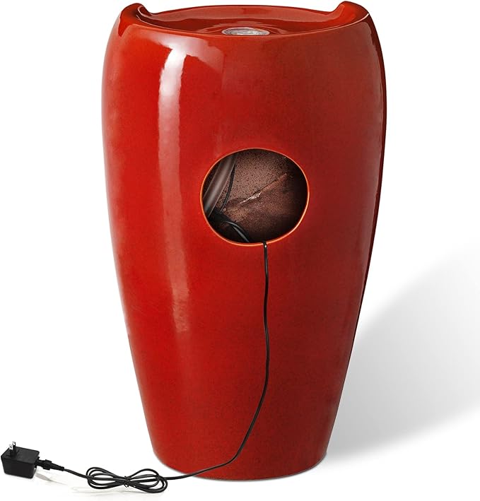 - Relaxing Water Sound: Rustic ceramic water fountain offers vintage yet modern accent. Features trickling water rippled and sparkled in the warm white LED light, elegant and charming kiln-fired red finish. With a stylish antique look, the fountain brings a touch of natural beauty, the soft sound of cascading water is sure to make you relax and makes a soothing rest for you in the garden. The pump can be adjusted to prevent loud water sound