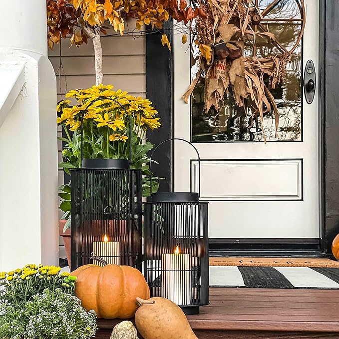 - MODERN OUTDOOR DECOR - Stylish black metal lantern with realistic LED candle. 2 C Batteries included. Dimensions: 8 Inch D by 16 Inch Tall.