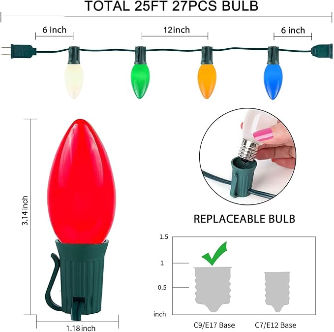 - C9 Incandescent Christmas Lights outdoor:C9 Christmas lights are designed with 7 watts per bulb, ensuring a brilliant illumination while conserving energy.Crafted with precision,christmas lights c9 come with a C9/E17 candelabra base and are UL Listed for both outdoor and indoor use. Their incandescent nature offers a warm, inviting ambiance.