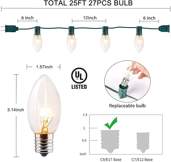 - [Easy to Install] Each C9 Christmas bulb is 3.14 inches high and 1.18 inches wide. 6-inch lead with male plug, 12-inch bulb spacing, 6-inch tail with female connector. The bulb has a C9/E17 candlestick socket base that can be connected end-to-end.
