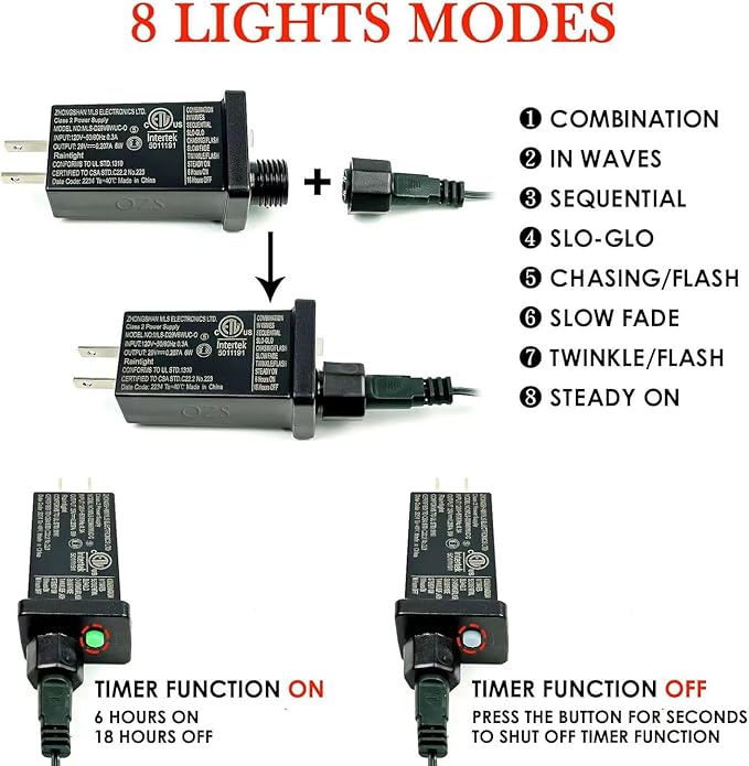 - 8 Modes & Multiple Choice: Press the button on the transformer to choose from the 8 different light effects: Combination, In Waves, Sequential, Slo-glo, Chasing/Flash, Slow Fade, Twinkle/Flash, and Stay On. Switch modes on demand, rich choice for you to create a beautiful and gorgeous festive atmosphere.