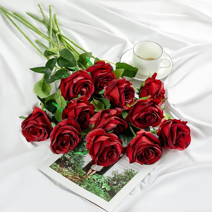 Hawesome 12PCS Artificial Silk Flowers Realistic Roses Bouquet Long Stem for Home Wedding Decoration Party (Wine Red 1)
