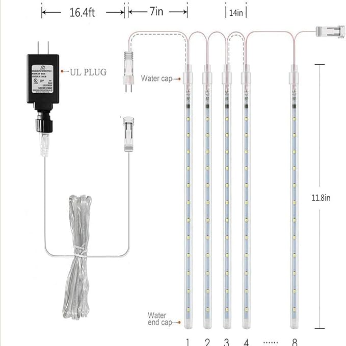 - [Brighter & Specs Xmas Lights outdoor]Lauzior outside Christmas lights have 8 tubes. The tube length is 12 inches/30cm, 24 LEDs per tube, 192 LEDs in total. Length of power cord is 16ft, total length of 8 tubes is 10ft. Our Christmas string lights are brighter and last longer, let you fully enjoy the joy of family time.