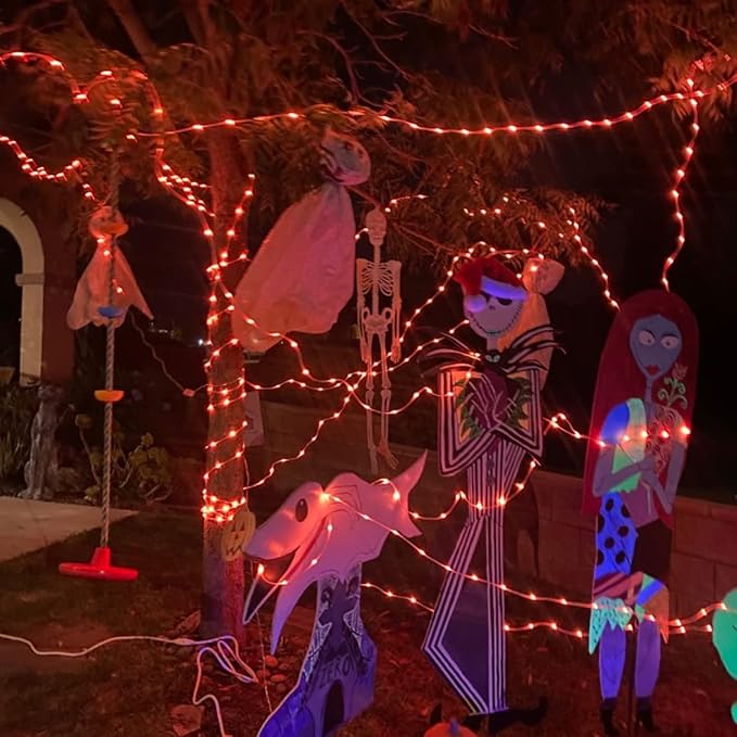 - Brilliant Outdoor Decor: 100 LED starry-style fairy lights with orange light accent your space with a unique, inviting glow. 33ft length is perfect to put around a garden or porch railing.They were the finishing touch for a back yard bbq, party, wreath, fence, patio, pools, bush, holiday, indoor, outdoor. In the dark, the wire fades to invisible, leaving only the fairy lights, create a classy and spooky atmosphere.
