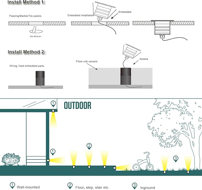 - 5. PACKAGE INCLUDED - 2 x LED Step Lights, 2 x Ground Embedded Parts. Each LED Deck Light is lengthened with 11.8 inch(30cm) wire.