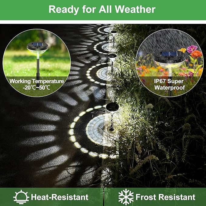 - ♻【Creative Design&Attractive pattern】Outdoor solar pathway lights are designed well with adjustable height and convenient external switch,excellent lighting design greatly meets your different lighting and decoration needs,such as halloween and christmas.Solar yard lights with the black exquisite appearance and crystal transparent cover looks more advanced and textured,which casts charming patterm raise your yard grade and house's value,also allow you to enjoy the light shows every night.
