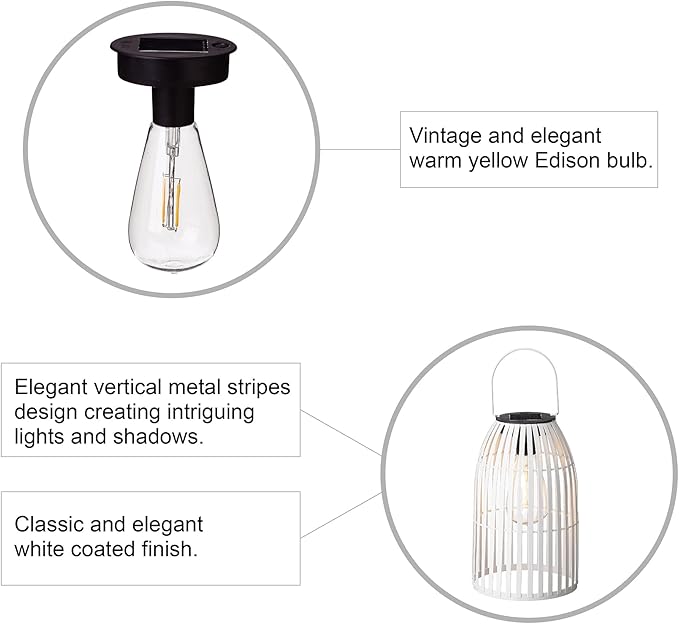 - 【Solar Powered Lantern】 Traditional farmhouse hanging lantern design, novelty birdcage shape main body and warm yellow Edison bulb. This Solar Lantern can be hung on anywhere you want, perfect for garden, yard, patio, porch, wall, pathway, driveway, lawn, camping, trees, pergolas, etc. outdoor solar landscape lighting and decoration.