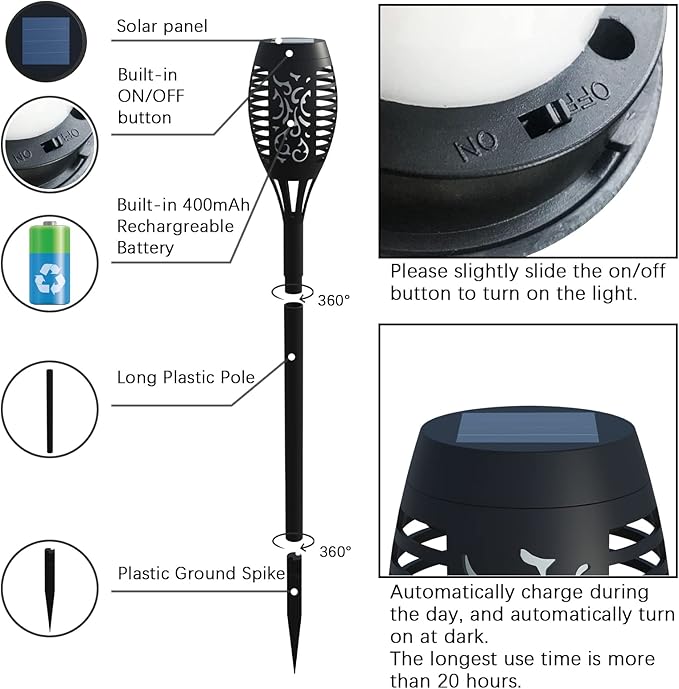 - ๐ฅใAuto Charge & Auto Light Upใ: Solar tiki torches for outside automatically collect solar energy all day in direct sunlight and turn it into electricity to continuously charge the battery and include a photosensitive control switch on its solar panel, From dusk to dawn (no sunlight), the lights are automatically turned on, and when the sun rises (the solar panel receives sunlight) the lights will automatically turn off and charge automatically. Convenient and practical.
