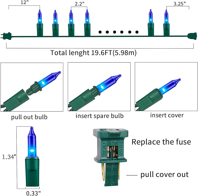 - 【Green Wire Christmas String Lights Decoration】:100L traditional incandescent Christmas light set,19.6Feet Blue Christmas Mini String Lights,each set include 4 Extra Bulbs & 2 Replacement Fuses.Perfect for indoor and outdoor decoration.Plug in,put it where you want,watch and enjoy this light.The light can be reused for many years.