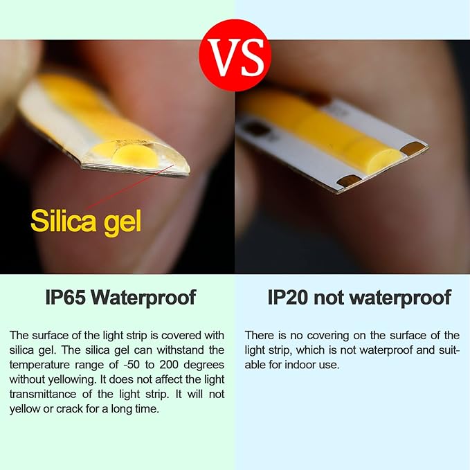 - 【IP65 Waterproof】IP65 waterproof LED strip is covered with a layer of silicone, if you need to weld, use your fingers to remove the silicone from the soldering point before welding.