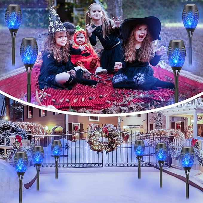 12-Pack Blue Solar Flickering Flame Torches – Waterproof Solar Garden Lights, Outdoor Solar Lights for Yards, and Flame Torches for Patio and Pathway Decorations
