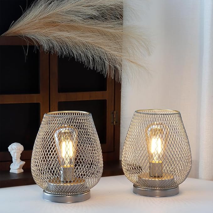 JHY DESIGN Set of 2 Metal Cage LED Lantern Battery Powered Cordless Accent Light with LED Great for Weddings Parties Patio Events for Indoors Outdoors(Silver)