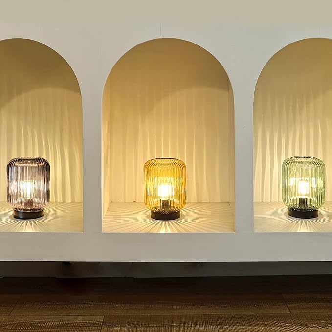 - 【DECORATIVE GLASS TABLE LAMP】 Our battery operated lamp is made of high quality glass, which features a modern elegant style and is more valuable. Different from plastic table lamps, it is more durable in daily use. You can decor your home by putting this modern lamp any where and when you turn on the cordless lamp, it emits beautiful luminous light and adds romance to your home. Must be a nice addition for your bedroom and hallway...