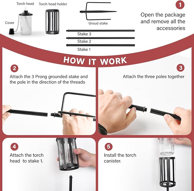 - 【Easy to Assemble】No tools needed, just screw all the parts together as the instruction. Upgraded 3-prong stakes make the torches more stable.