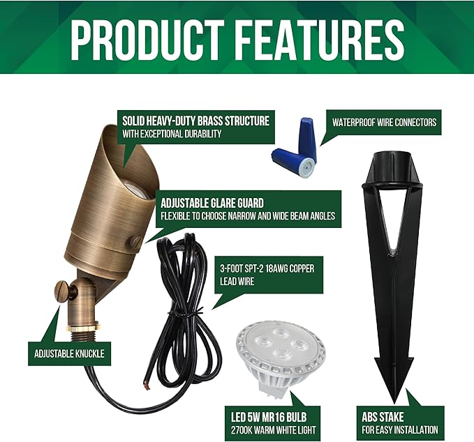 - Easy Installation:Equipped with ABS ground spike, wire connectors (1 #14 w/1-3 #18 or 20, 2 #14 w/1 #18), MR16 bulb and 39.9’’ pre-wired leads, these lights can be easily installed. Compatible with most 12V landscape lighting systems. Must be powered by a 12V low voltage transformer (not included).