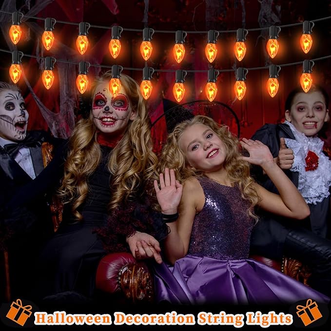 - 🔥Halloween Flame String Lights: Halloween string lights total 25FT with 27 C7 clear orange flame lights (2 spare). 6'' lead with male plug, 12'' spacing between bulbs, 6'' lead with female plug. The C7 Flame bulbs are 1 watt, and E12 bases.