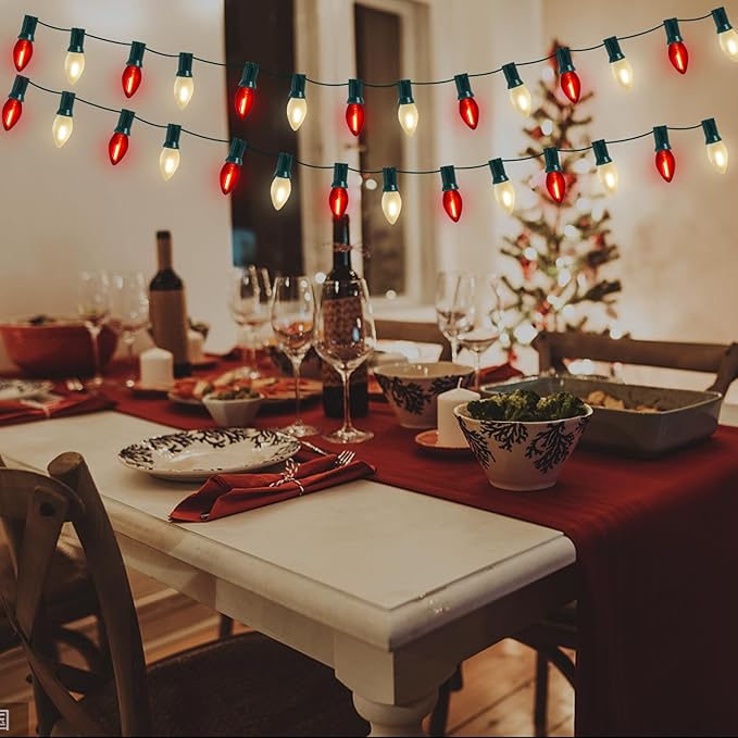- ๐ End-to-End Connectivity: 25Ft led christmas lights is end-to-end connector, 6" spacing from male plug to the first bulb, 12" spacing between bulbs, 6" spacing from last bulb to tail female connector. C7 red white and white christmas lights can be connected up to 28 strands together to cover larger areas and create a uniform holiday lighting display.