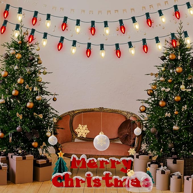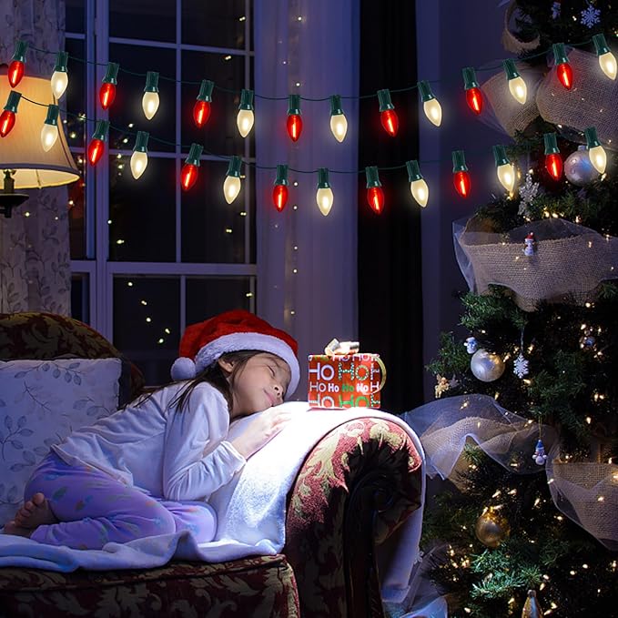 - ๐ Versatile Application: Multicolor christmas decorations lights glow a warm white lights, retro Christmas light string is dimmable, lights dimming requires a dimmer. c7 led christmas lights can be used both indoor and outdoor, such as the bedroom, bar, window, Christmas tree, party, wedding, window, holidays, festivals, shows, restaurants, hotels, shopping centers, patio, or porch, pathway, roofline decorations and lightings