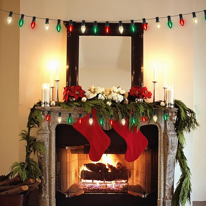 - Led Multicolor Christmas lights: C7 Led multicolor Christmas lights string outdoor with red/green/frosted white bulbs glow naturally warm, creating a vintage effect or antique atmosphere and romantic atmosphere. C7 led Red Green/White Christmas lights Perfect for wedding, birthday, Valentine's Day decoration and lighting.