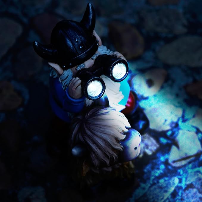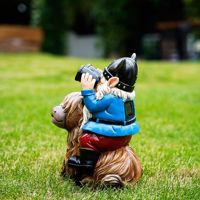 Tolimi Garden Gnome Sitting on Highland Cow Outdoor Statue wiht Solar LED Light Funny Decoration for Yard and Patio Gifts (Gnome)