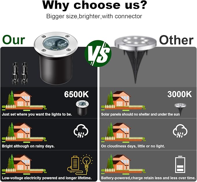 - ★Upgraded Bright LED Chip:4Pack 3Watt Inground Lights with 8pack wire connectors,300Lumens per lights,6500K Cool White light,high quality LED chip,lifespan up to 50,000 hours. Perfect for low voltage landscape lighting of pathway, garden, fence, deck, wall, pool, yard, patio.