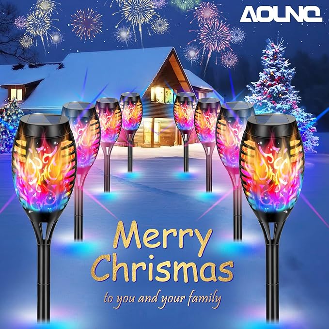 - ๐ฅใGorgeous Color Dance Famesใ: Happy Christmas! Our solar Christmas light with multi -color flame is an excellent choice for outdoor Christmas decoration.The solar Christmas lights are designed according to the real flames. While flashing the gorgeous multi -color dance flames, it will emit safe soft and enhanced emotional light.This makes solar lights can effortlessly become the talk of the neighborhood, transforming your house magically into a Christmas wonderland.