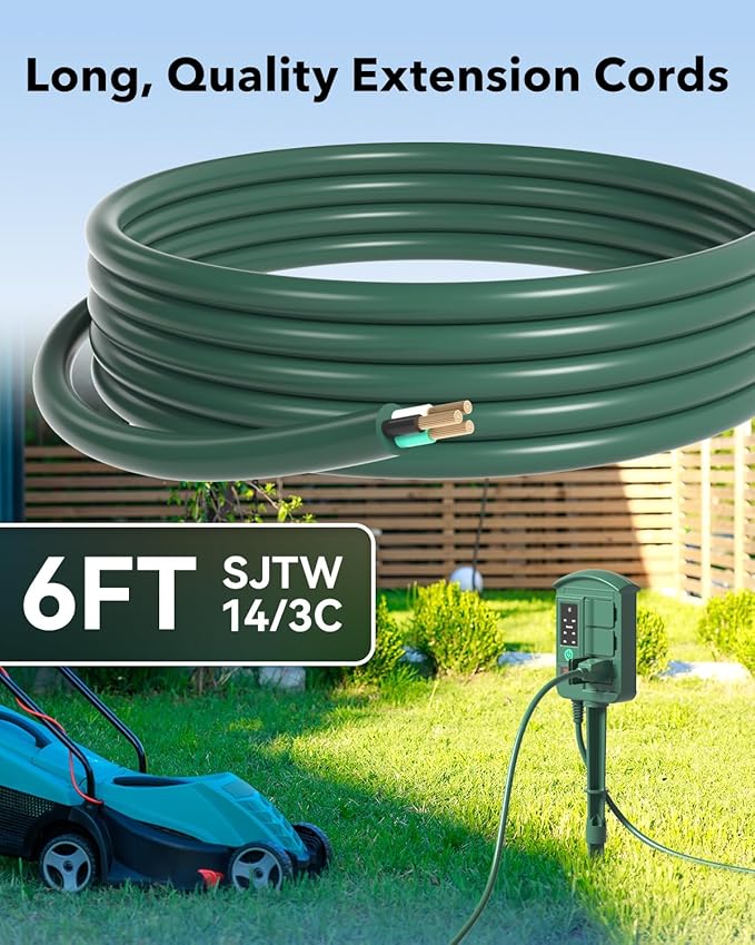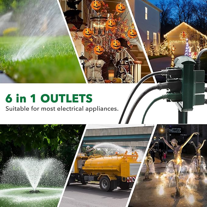 - Weatherproof & Safe: Designed for outdoor use, each outlet has a protective cover to shield it from water, dust, and debris. Please fully insert the plug when using and unplug before cleaning.