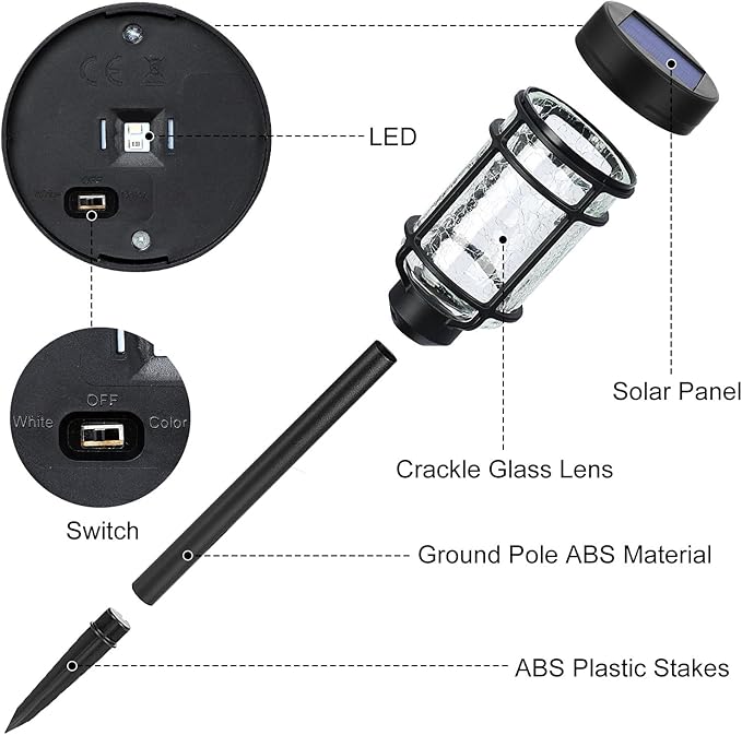 - Crackle Glass Solar lights: The solar pathway lights feature a crackle glass lens and black finish plastic frame. Classic design with warm white lighting is ideal to place in flower beds, landscaping, along pathways, or along driveways. Dia 2.7x18 inch.