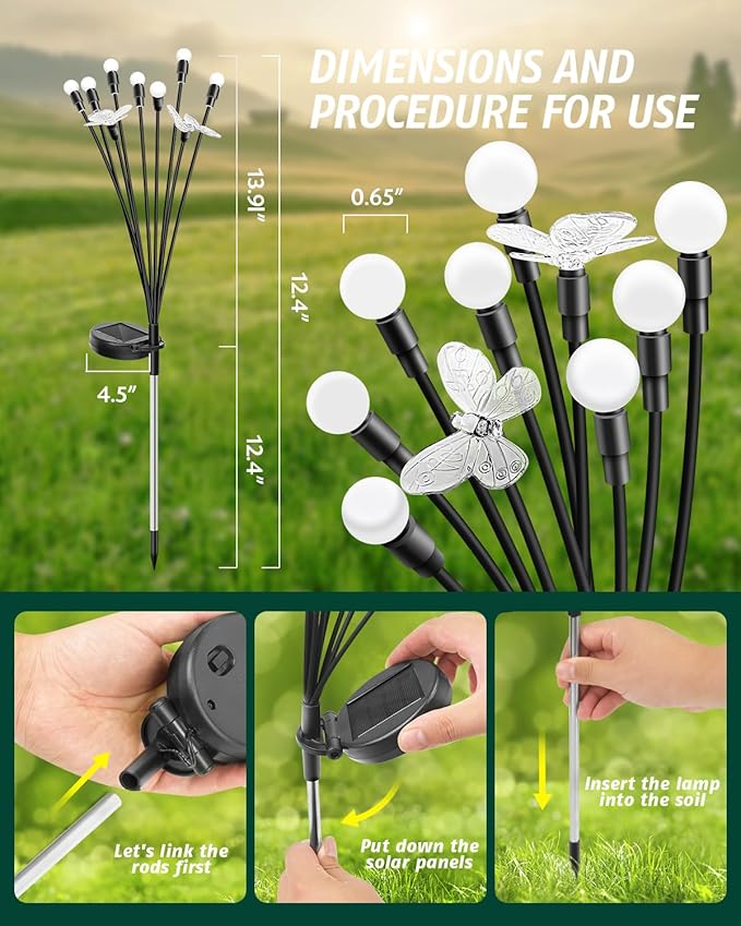 - 2024 upgraded Solar Garden Lights: The most unique solar garden lights, not monotonous, 8 firefly lights +2 butterflies, more vivid and natural, long bright and flickering 2 lighting modes