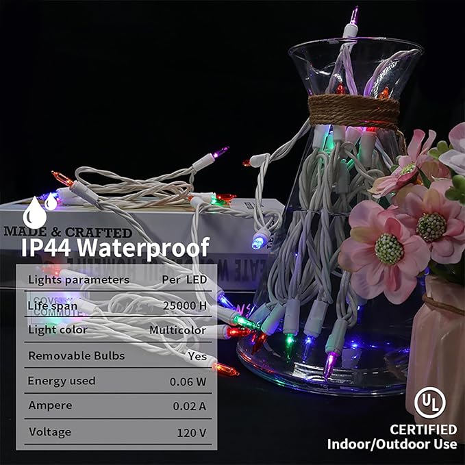 - 【Mini Christmas Lights Specification】: 1 Sets - white wire chritsmas light string includes 35 count multicolor LED lights, total length 13.6ft, lights length 11ft and each led is 4 inches apart, 24 inches lead wire, 4 inches end connector (Extra 2 x bulbs and 1 x fuse included)
