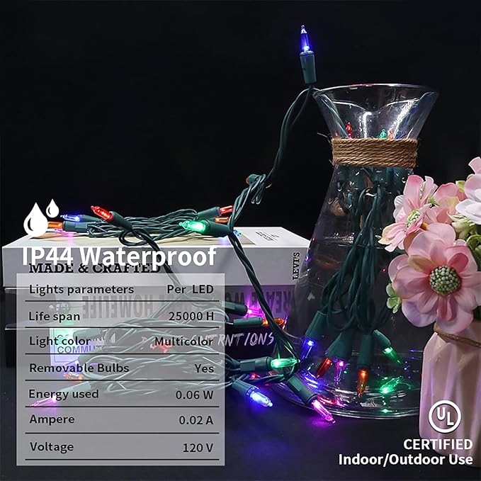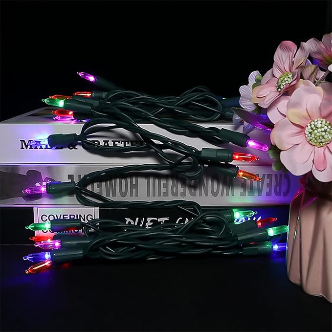 - 【Mini Christmas Lights Specification】: 1 Sets - green wire chritsmas light string includes 35 count multicolor LED lights, total length 13.6ft, lights length 11ft and each led is 4 inches apart, 24 inches lead wire, 4 inches end connector (Extra 2 x bulbs and 1 x fuse included)