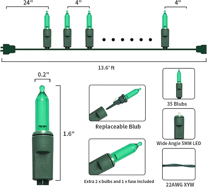 - 【Mini Christmas Lights Specification】: 1 Sets - green wire chritsmas light string includes 35 count green LED lights, total length 13.6ft, lights length 11ft and each led is 4 inches apart, 24 inches lead wire, 4 inches end connector (Extra 2 x bulbs and 1 x fuse included)