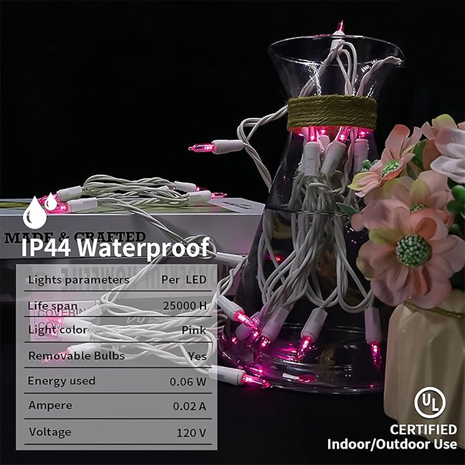 - 【Mini Christmas Lights Specification】: 1 Sets - white wire chritsmas light string includes 35 count pink LED lights, total length 13.6ft, lights length 11ft and each led is 4 inches apart, 24 inches lead wire, 4 inches end connector (Extra 2 x bulbs and 1 x fuse included)