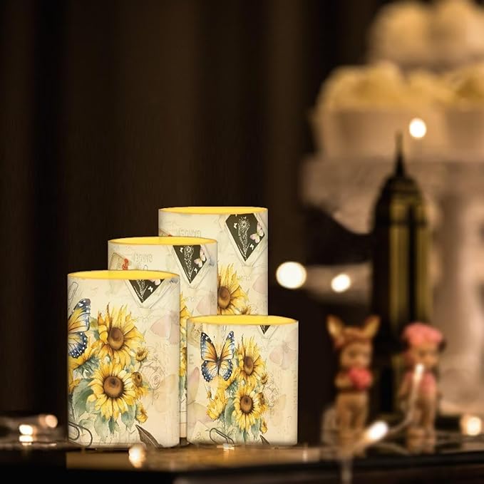 Flameless Candles Battery Powered LED Candles with Remote Timer Color Changing Control Long Lasting for Indoor Outdoor Home Table Decoration Set of 4, Butterfly Sunflower Retro