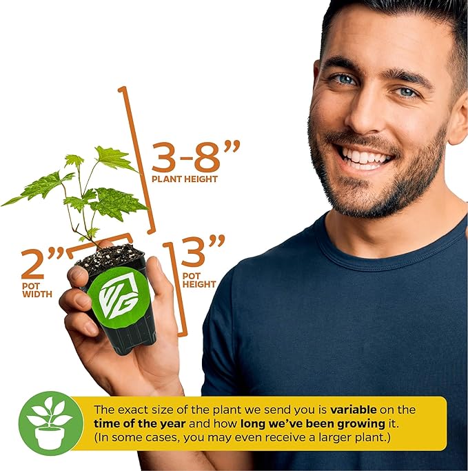 - SIZE UPON ARRIVAL: When your Southern Home Muscadine Grape plant arrives, you can expect it to be small, measuring between 3-8 inches in height. It comes potted in a 3-inch-deep pot, ensuring easy handling and transplanting as you begin the journey of nurturing this beautiful vine.