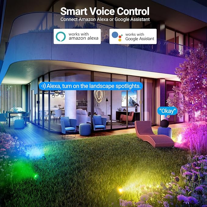 - [Individually Control Each Bulb & Voice Control] You can individually control the colour, brightness, on/off for each bulb. Landscape spotlights can not only be controlled by APP or controller, but also work with ALEXA or Google Assistant. Activate voice control, free your hands