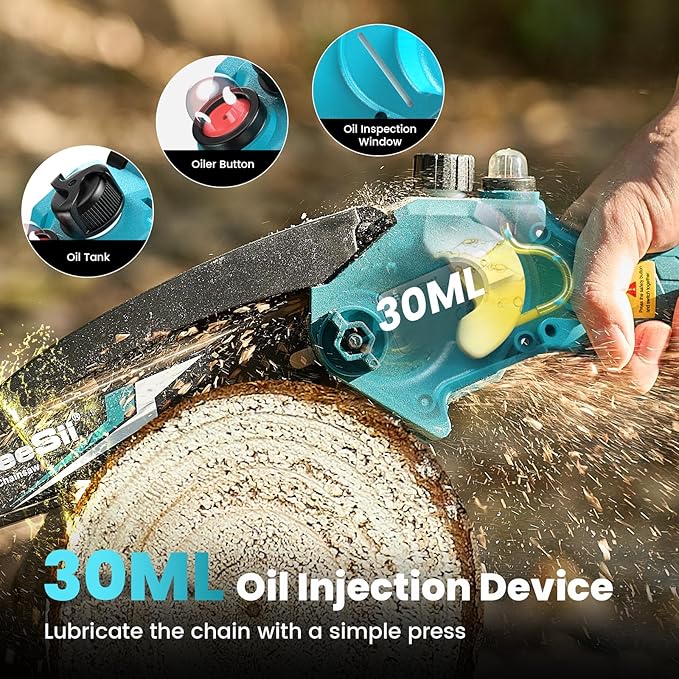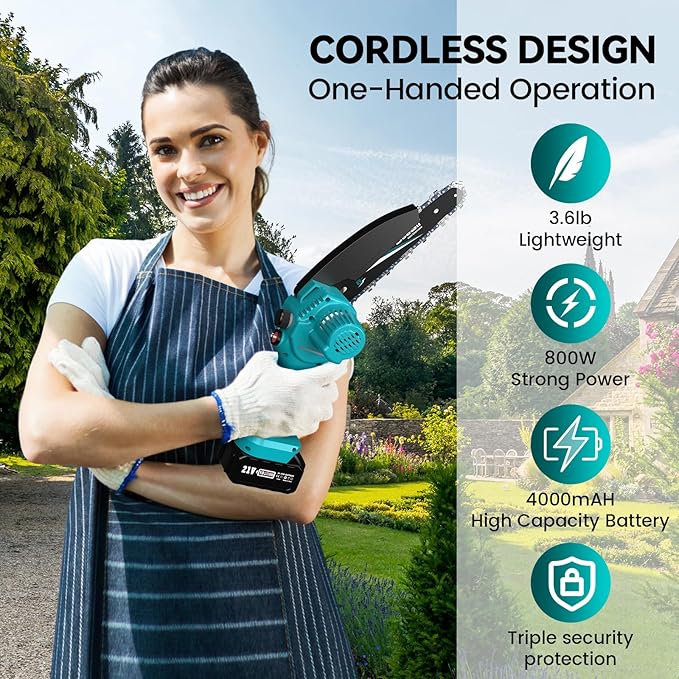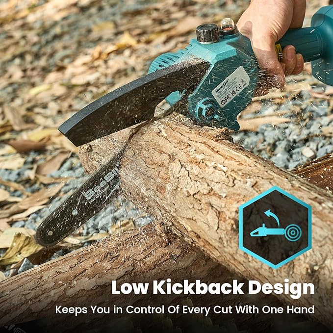 - ✅【DETAILS IN SAFETY DESIGN】8-inch mini chainsaw cordless has added a safety lock switch and splash guard. To prevent accidental starting, the safety lock and trigger must be pressed simultaneously to start the saw. Anti-splash baffle prevents wood chips from splashing during work.