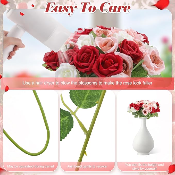 - Effortless Elegance: These faux roses need no water or sun, just a light dusting. Ideal for grand weddings, they rival real blooms in charm. Note: If stems are bent or flowers squished, adjust and use a hairdryer for a lifelike look