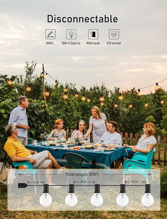 - 4 spare bulbs: 100 hanging sockets bistro string light with 6 inch lead, 12 inch spacing between bulbs, 6 inch tail with female connector, total length 100 feet with 100 glass bulbs and 4 spare bulbs. Not connectable