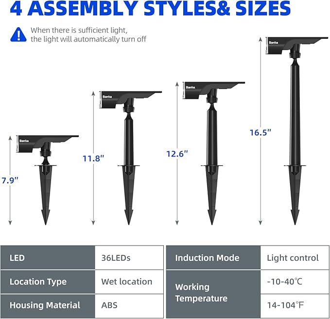 - 4 Assembly Styles and Size: With specially designed ground stake, you can easily assemble at different heights to suit your current needs to insert the spot lights into the ground as landscape spotlights.Perfect for patio, porch, deck, pool, yard, garden, garage, driveway, pathway, etc