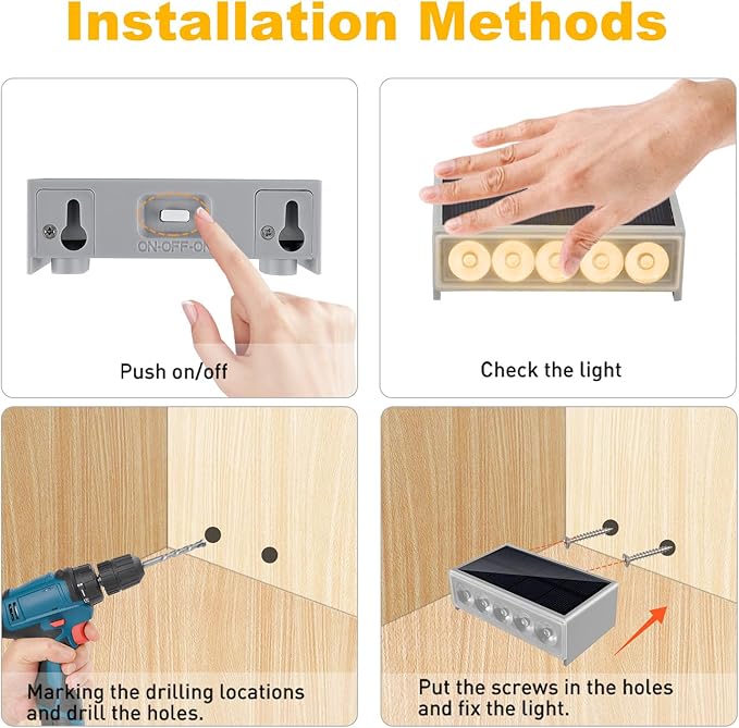 - 【10-12H Long Lighting】Solar LED step light come with high-quality solar panel in the case of sufficient sunshine, the solar charging time is 5-6H, which is enough to supply power to the warm white step light for up to 10-12H. Push on/off: pushing left or right means turning on the light, easy to operate and save your precious time.